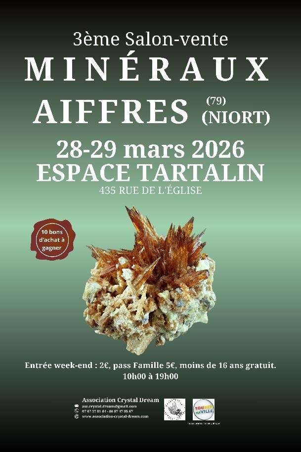 | AIFFRES (79 - près de Niort, Deux-Sèvres) 3 ème salon minéraux et fossiles (je serai présente à ce salon) / Espace Tartalin, 435, rue de l'église. / 28 au 29 mars 2026 |