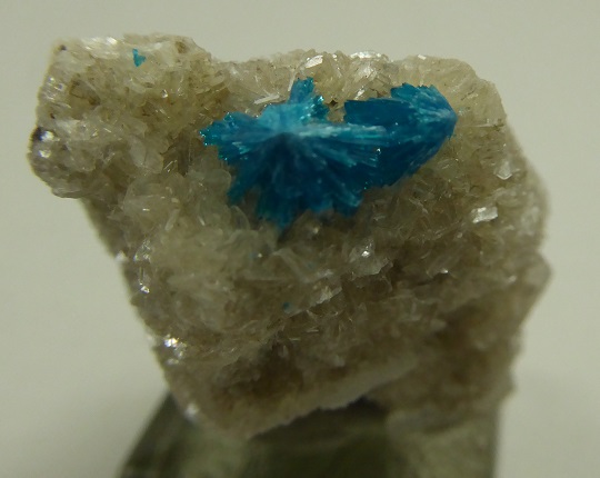 | CAVANSITE, stilbite / Carrière Wagholi, Ahmadnagar, Poona, Maharashtra, Inde / Belle petite pièce montrant un cristal clivé de cavansite. On se rencontre de l'aspect fibroradié du cristal. Il mesure 0,5 cm et repose sur un lit de stilbite blanche. | ![]() |