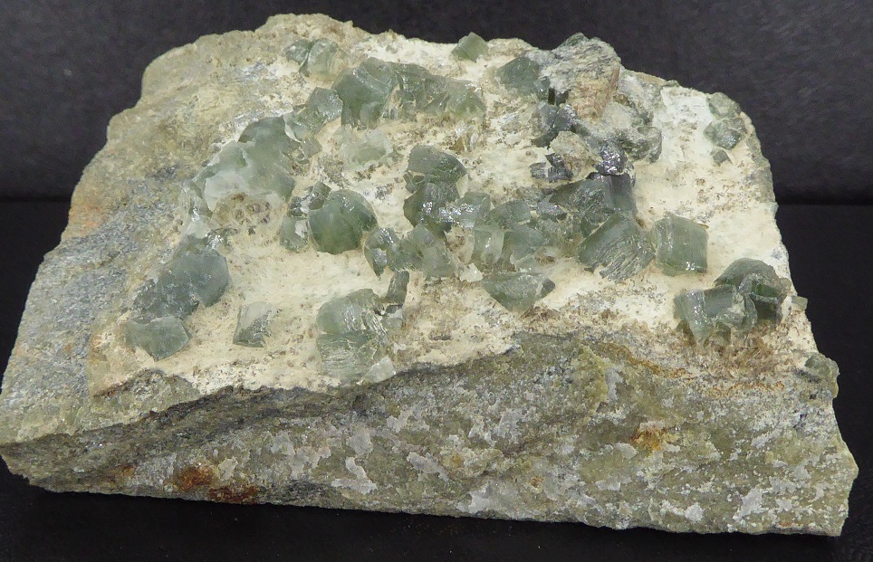 | Description : | Très bonne pièce de prehnite cristallisée en forme de "casque". Les cristaux sont très verts, cela est dû à des inclusions d'actinolite. Les plus grands mesurent 0,5 cm. |