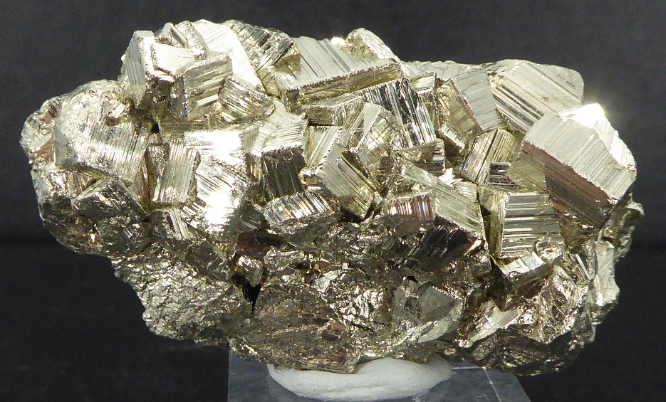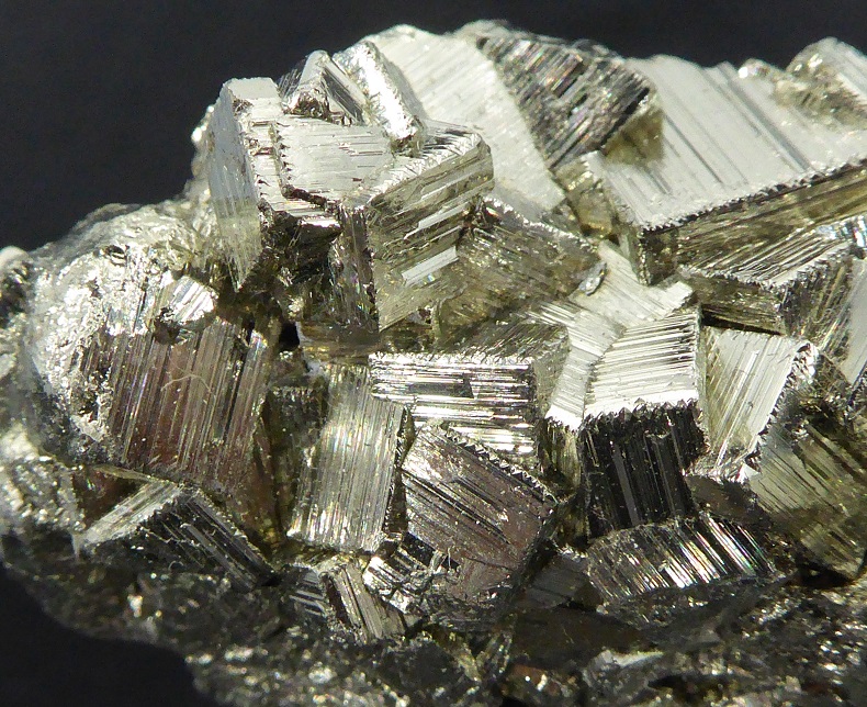 | PYRITE / Mine de Huanzala, district de Huallanca, Ancash, Pérou / Bonne pièce de pyrite cubique montrant des troncatures complexes et des striures sur les faces. Les cristaux sont très brillants à éclat métallique. Les plus grands mesurent 0,8 cm. | ![]() |