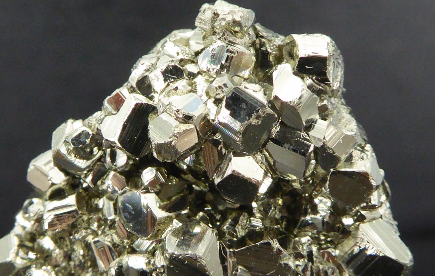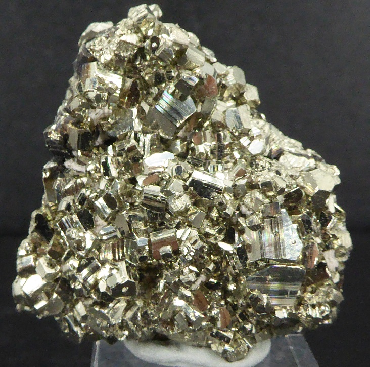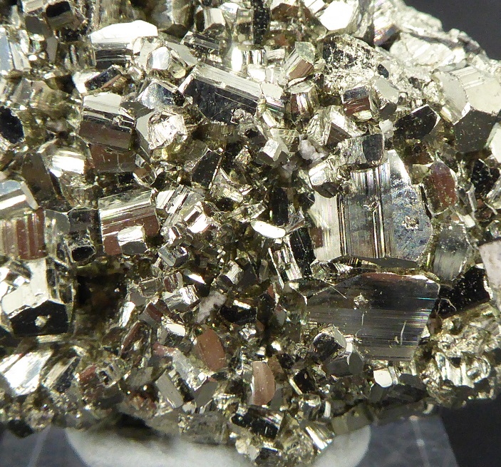 | PYRITE / Mine de Huanzala, district de Huallanca, Ancash, Pérou / Bonne pièce de pyrite cubique montrant des troncatures complexes et des striures sur les faces. Les cristaux sont très brillants à éclat métallique. Les plus grands mesurent 0,5 cm. | Disponible |