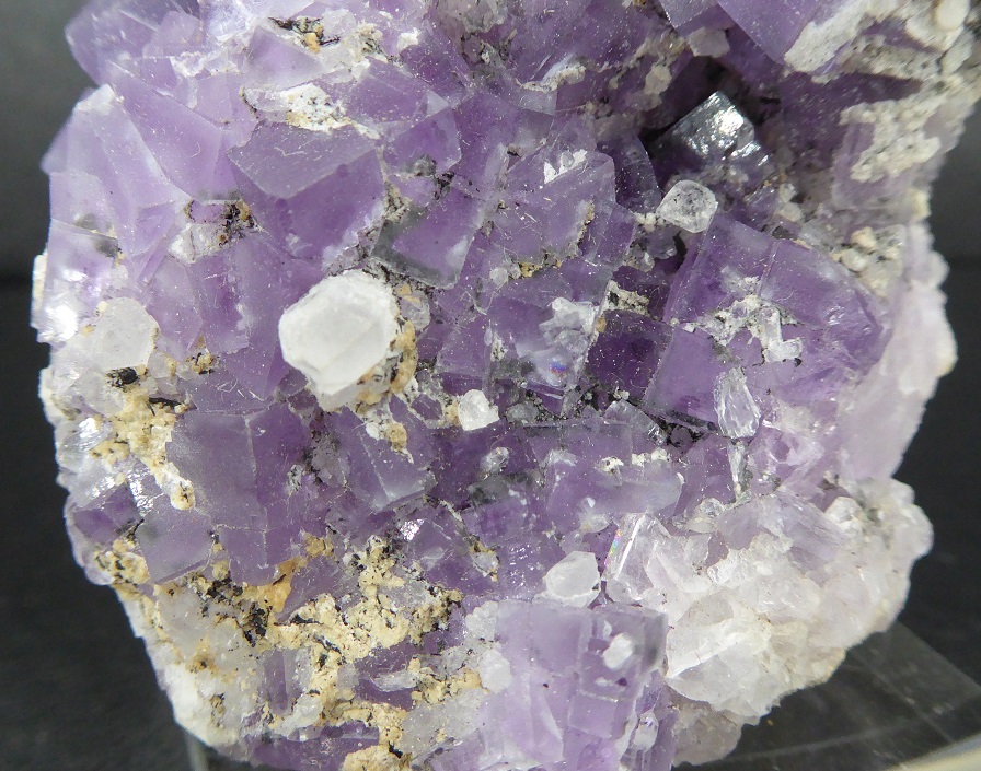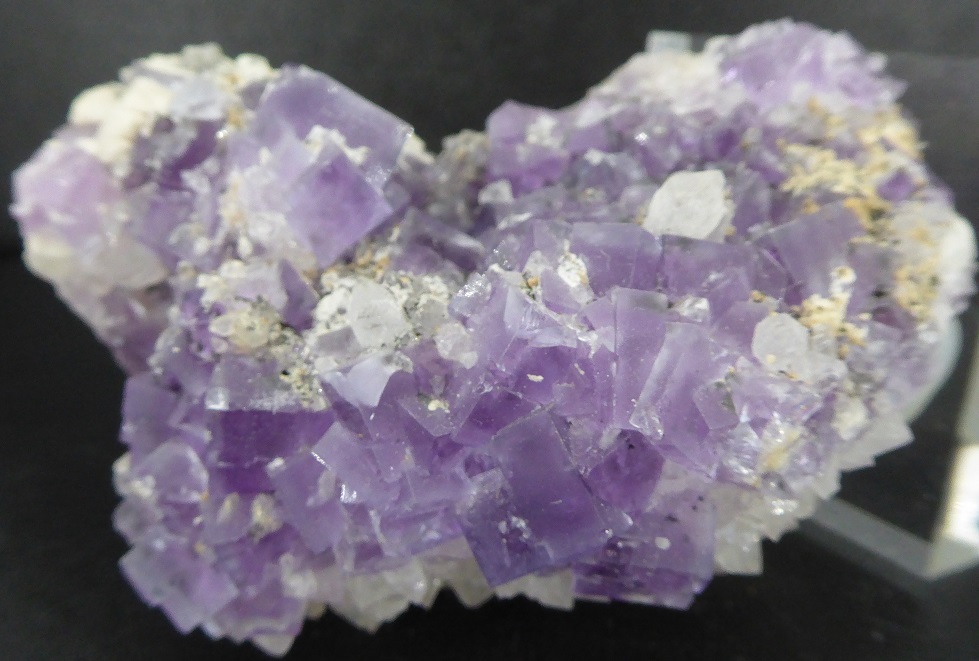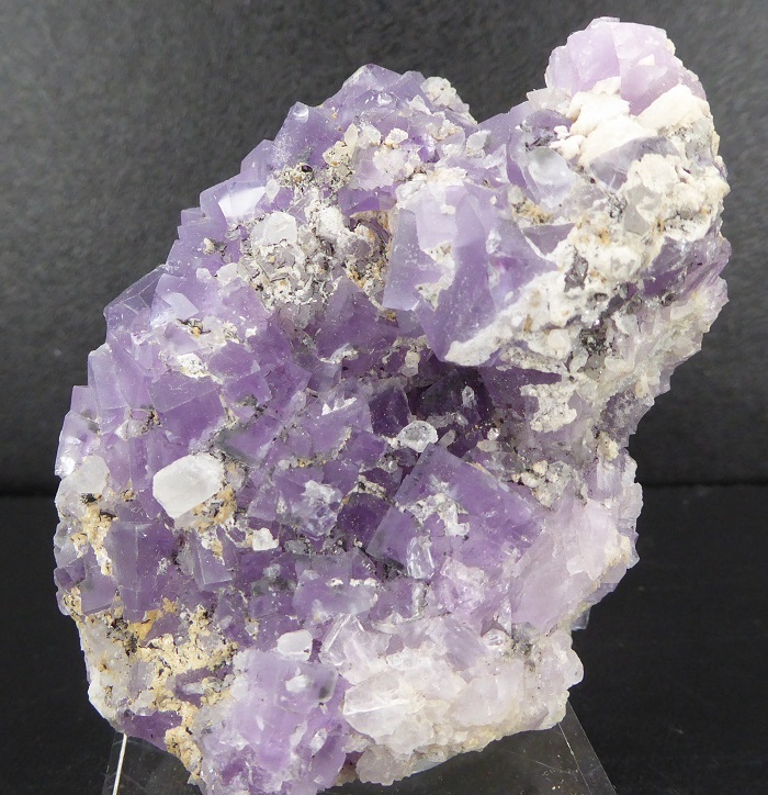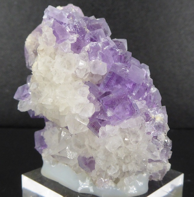 | FLUORITE, quartz / secteur minier de Berbès, Asturies, Espagne / Très belle pièce de fluorite violette, les cristaux les plus grands mesurent 1 cm. Ils sont associés à des quartz transparents à translucides mesurant jusqu'à 0,6 cm. Livré sur un socle. | Disponible |