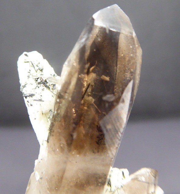 | Description : | Très belle cristallisation de quartz enfumé de 3,3 cm montrant un léger fantôme. Il est posé sur de l'albite massive d'où ressort quelques aegirines noires. |