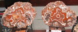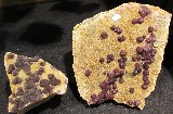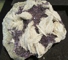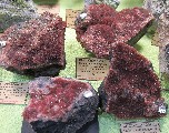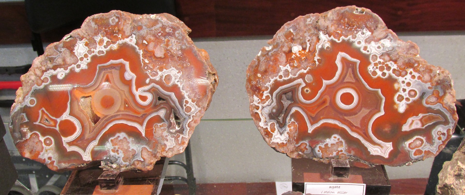 Guy Bousmaha proposait de belles pièces françaises dont 2 fluorites de Buxières-les-Mines (Allier) (photo I) des tranches d'agate de l'Etelon, Allier (Photo II) et une belle association de baryte blanche sur fluorite de Saint Péray, Ardèche (photo III).