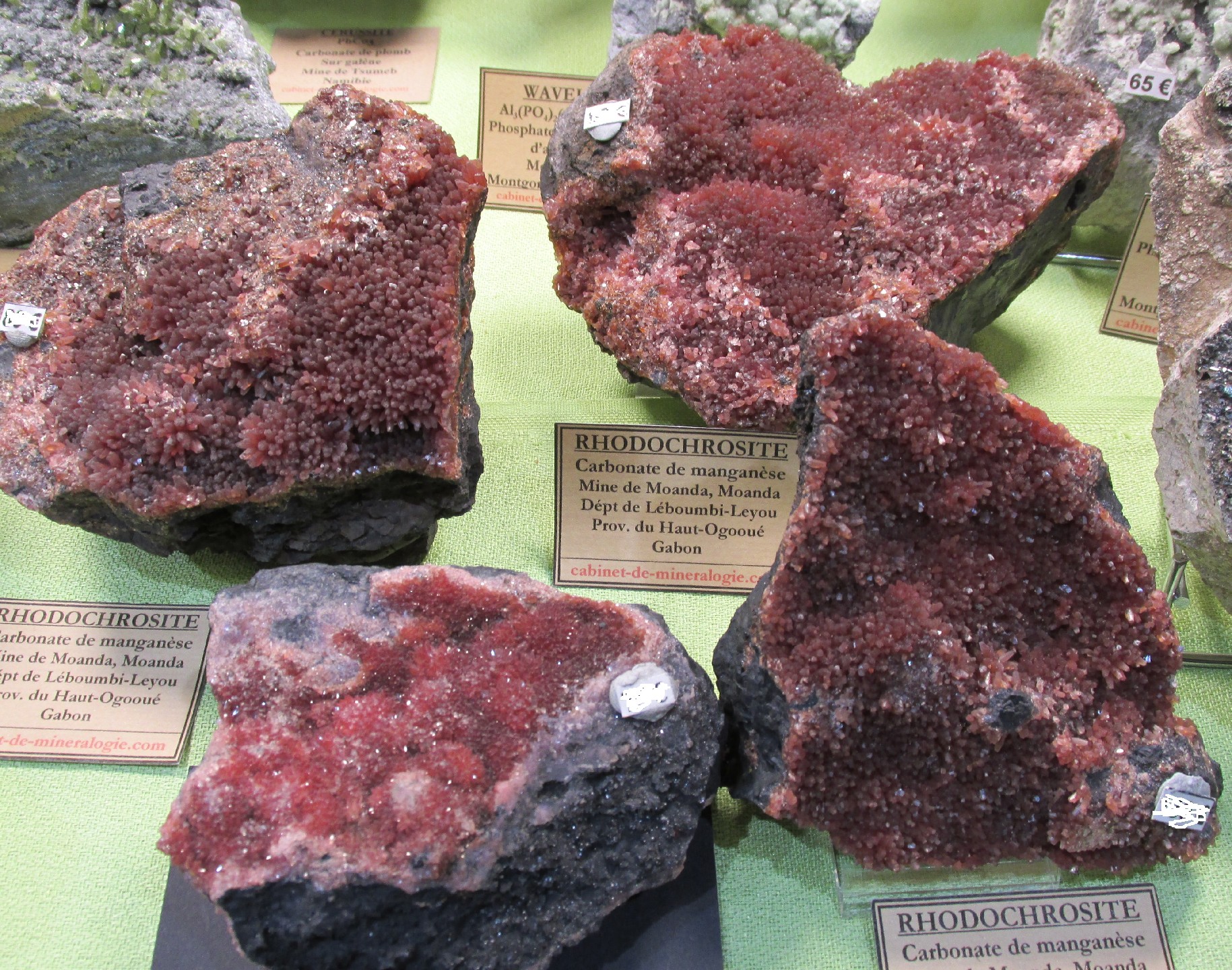 Sur mon stand, quelques belles pièces de rhodochrosite rose extraites dans les années 1980 provenant de la mine de manganèse de Moanda, Gabon (photo III) et une magnifique montebrasite gemme du Brésil et non de la localité-type de Montebras-en-Soumans où l'espèce a été décrite pour la première fois (photo IV). |