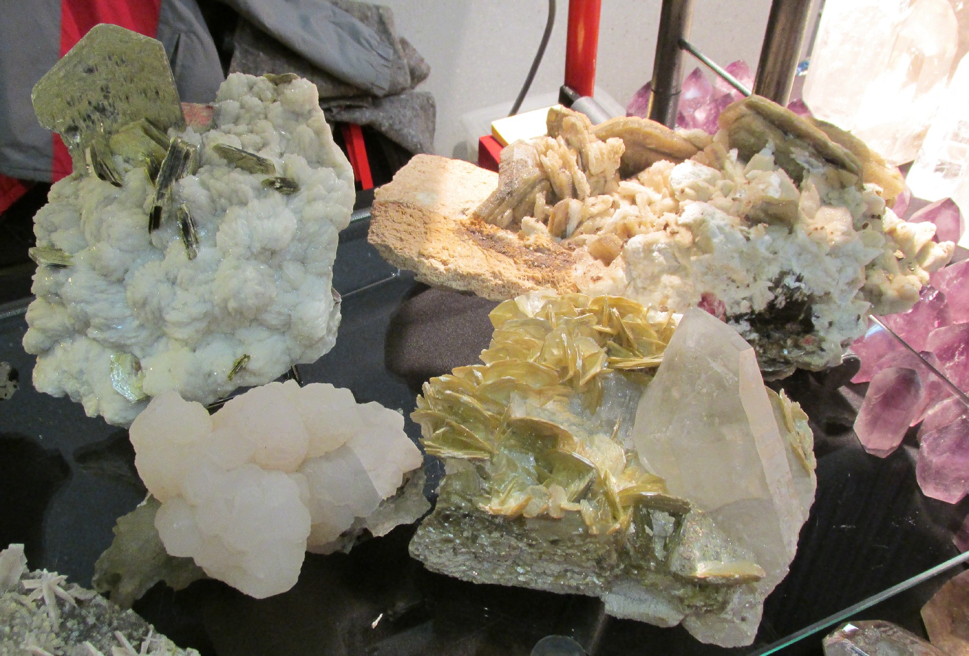 Sur le stand de Bruno Cardo, de belles pièces d'albite associée à des mica de la variété muscovite provenant du Brésil (photo I).