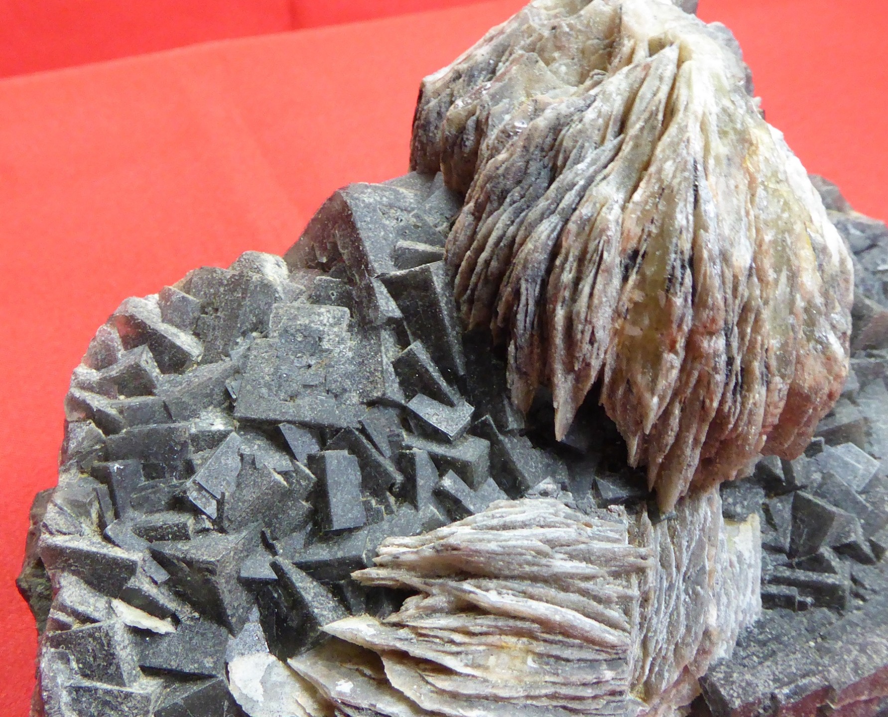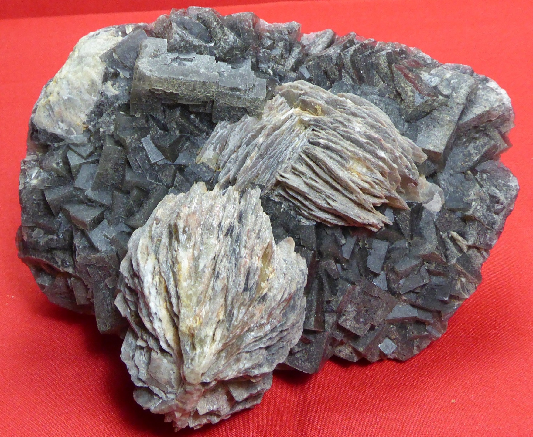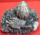 | Description : | Bonne pîèce de fluorite cubique grise à noire dûe à des inclusions de galène. Le plus grand mesure 3 cm. deux pompons de baryte crétée sont poséessur la fluorite. Le plus grand mesure 6 cm. |