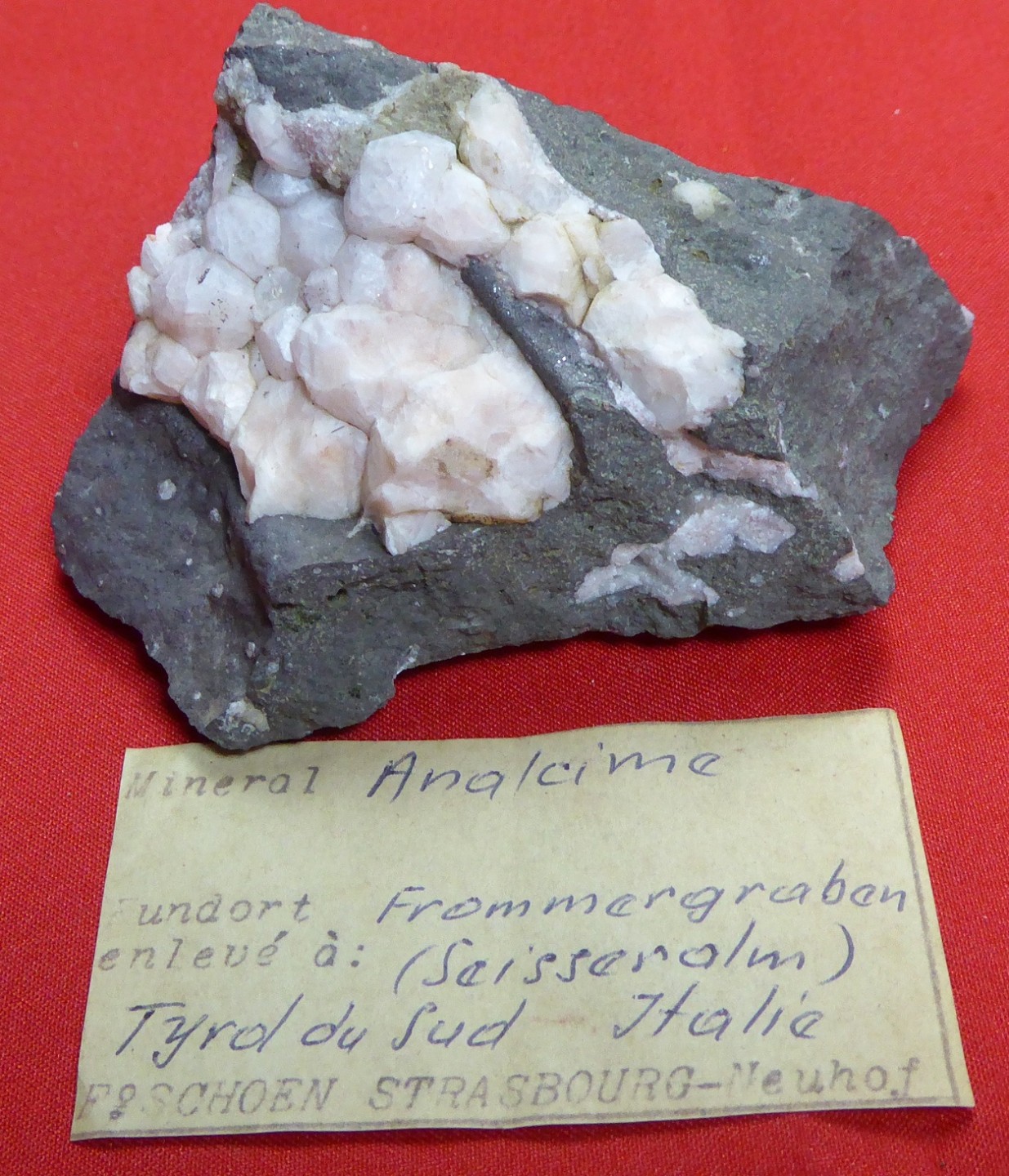 | ANALCIME / Alpe de Suisi, prov. autonome de Bolzano, Italie / Belle cristallisation d’analcime à éclat nacré reposant sur une gangue basaltique. Les plus grands cristaux mesurent 1 cm. Pièce accompagnée de son étiquette ancienne. | Disponible |