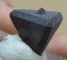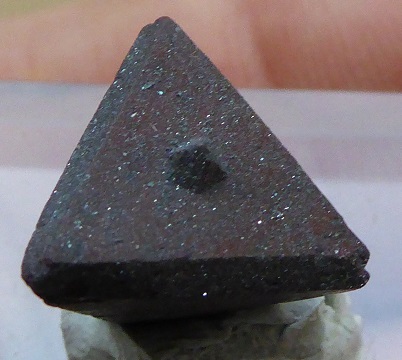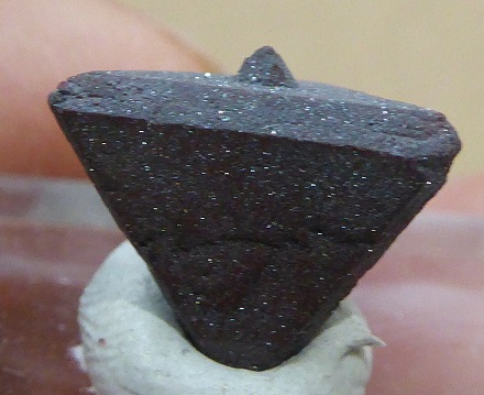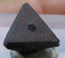 | ZUNYITE / Dôme de sel de Qalat-e Bala, Région de Bandar-Abbas, Hormozgan, Iran / Magnifique pièce de ce rare sorosilicate contenant de l'aluminium, du chlore et du fluor, nommée ZUNYITE. Le cristal est complet et montre un tétraèdre parfait avec de belles troncatures. Sa couleur est brune foncée à rougeâtre. Il est accompagné d'inclusions lamellaires brillantes d'hématite. Il mesure 1,2 cm pour la plus grande arêtre. Echantillon très rare et de provenance inhabituelle. Livré sur son socle. | Disponible |
