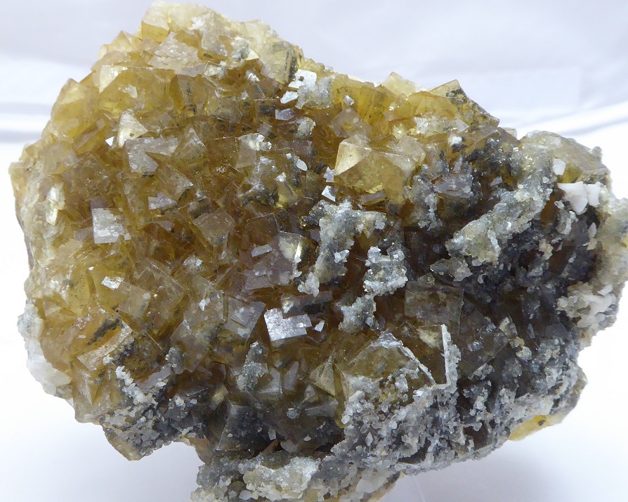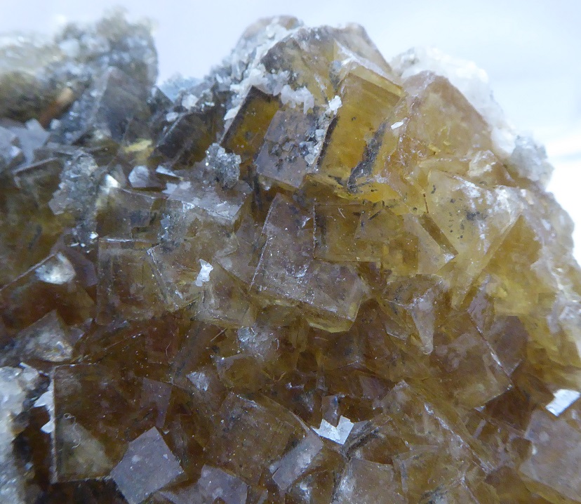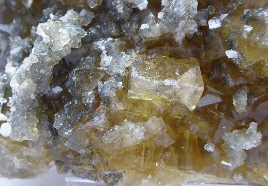 | Description : | Belle pièce de fluorite cubique translucide jaune mesurant jusqu'à 0,7 cm d'arête. Quelques cristaux de dolomie blanche et de calcite se trouve sur la pièce. |
