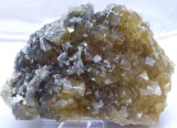 | FLUORITE, calcite, dolomie / Mine Moscona, Solis, secteur minier de Villabona, Asturies, Espagne / Belle pièce de fluorite cubique translucide jaune mesurant jusqu'à 0,7 cm d'arête. Quelques cristaux de dolomie blanche et de calcite se trouve sur la pièce. | Disponible |