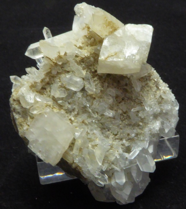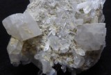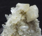 | Description : | Bonne pièce montrant deux cristaux d'adulaire blancs nacre de 1,4 cm pour le plus grand et de quartz transparent de 1 cm. |
