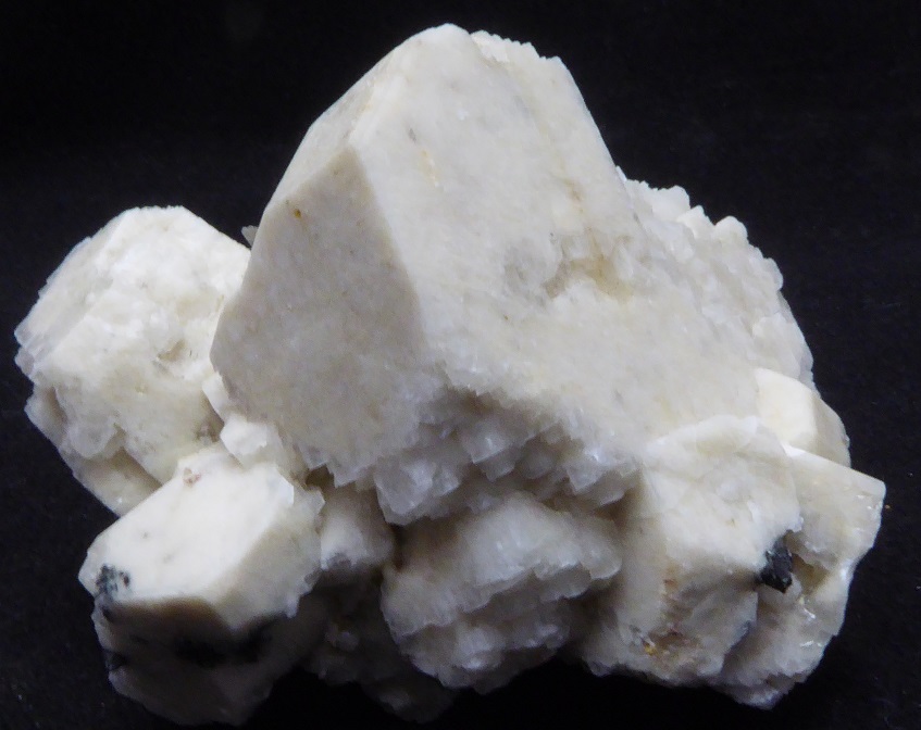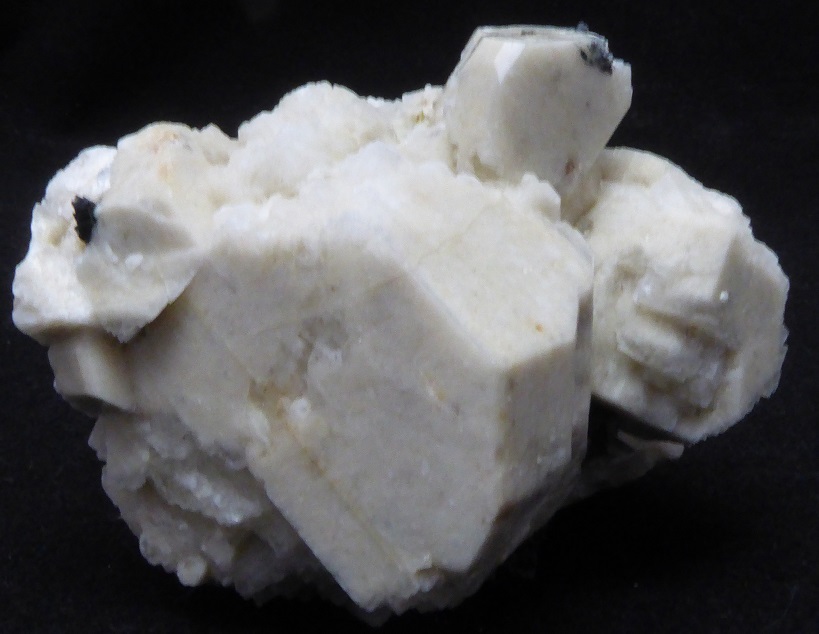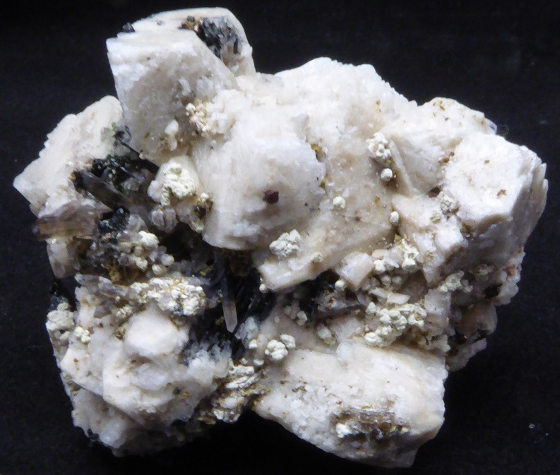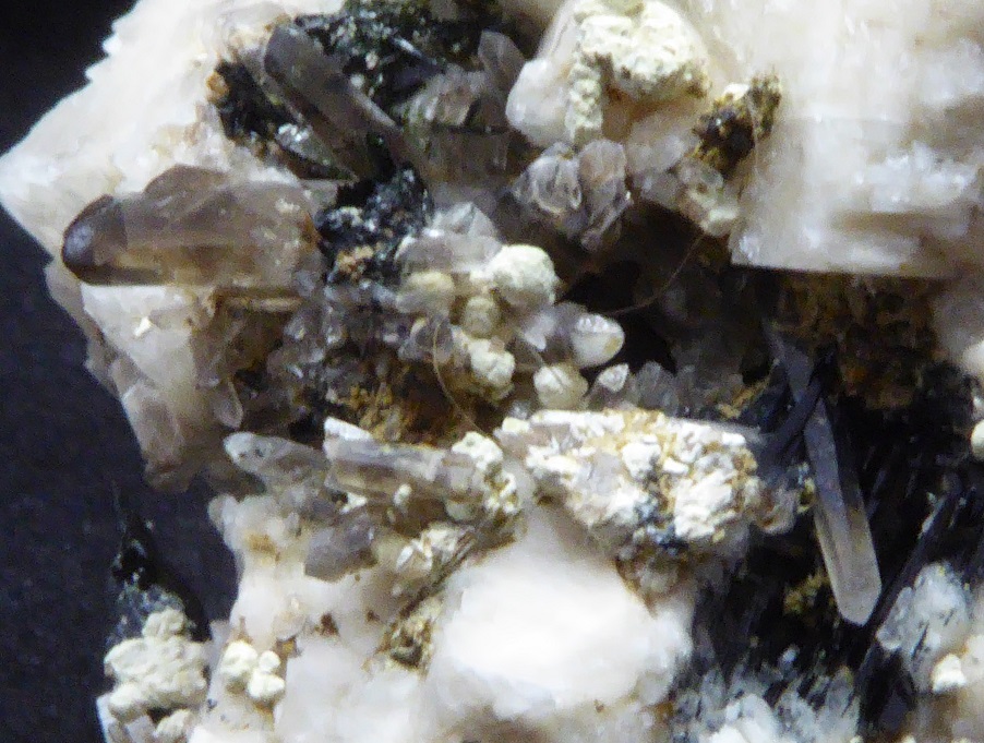 | Description : | Belle pièce de microcline associée à du quartz fumé de 1 cm, d'aegirine de 1,5 cm et d'un minéral blanc non déterminé. Un cristal d'orthose est clivée. |