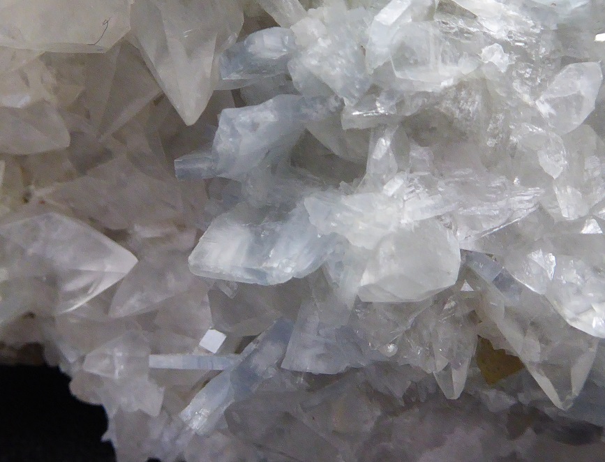 | CALCITE, BARYTE / Mine Moscona, Solis, Corvera de Asturias, Asturies, Espagne / Très belle pièce de calcite en scalénoèdres blancs à grisâtres translucide de 2 cm pour les plus grands. Ils sont surmontés de cristaux tabulaires bleus de baryte. Le plus grand mesure 1,5 cm et forme des rosettes. Quelques cristaux de baryte sont clivés. | Disponible |