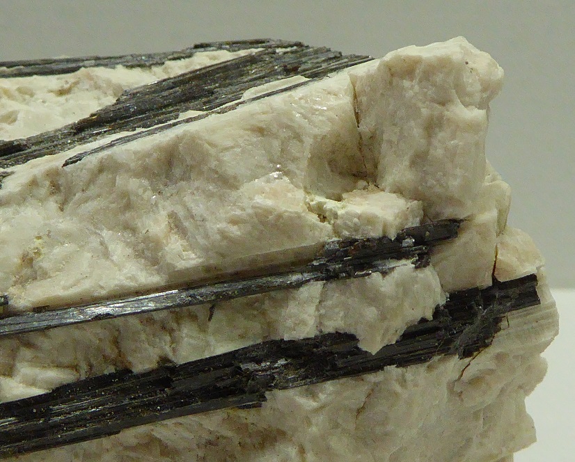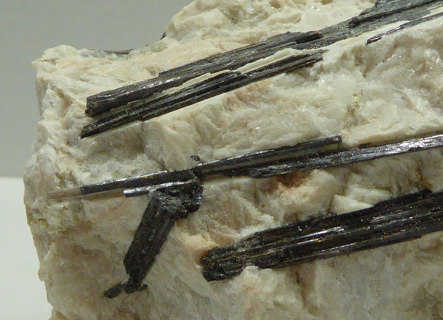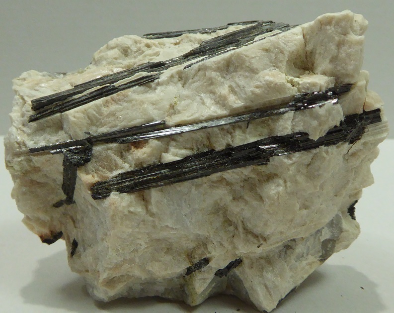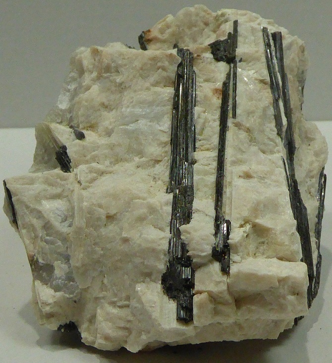 | TOURMALINE / Saint-Chély-d’Apcher, Mende, Lozère, France / Pièce intérressante de tourmaline noire en baguette de 6 cm pour les plus grandes incluses dans du quartz et du feldspath massif. | Disponible |
