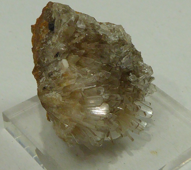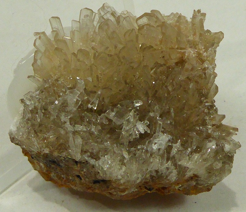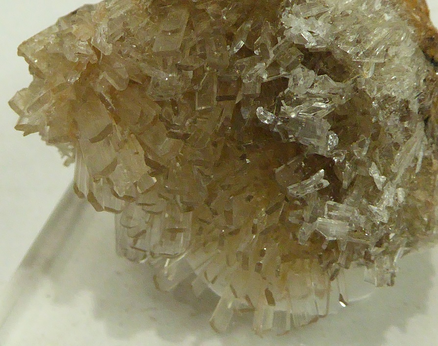 | HEMIMORPHITE / mine Ojuela, Mapimi, Mexique / Belle cristallisation d'hémimorphite en cristaux lamellaire blanc translucide mesurant jusqu'à 1 cm posée sur de la limonite. Pièce très esthétique. livrée sur son socle. | Disponible |