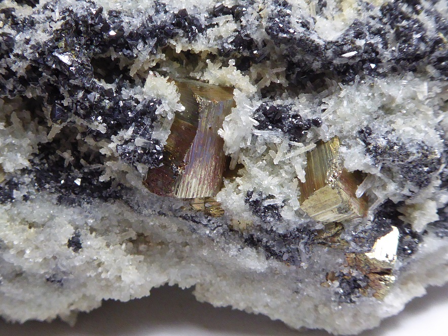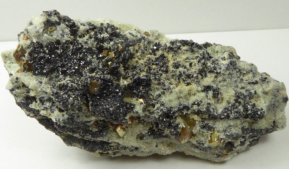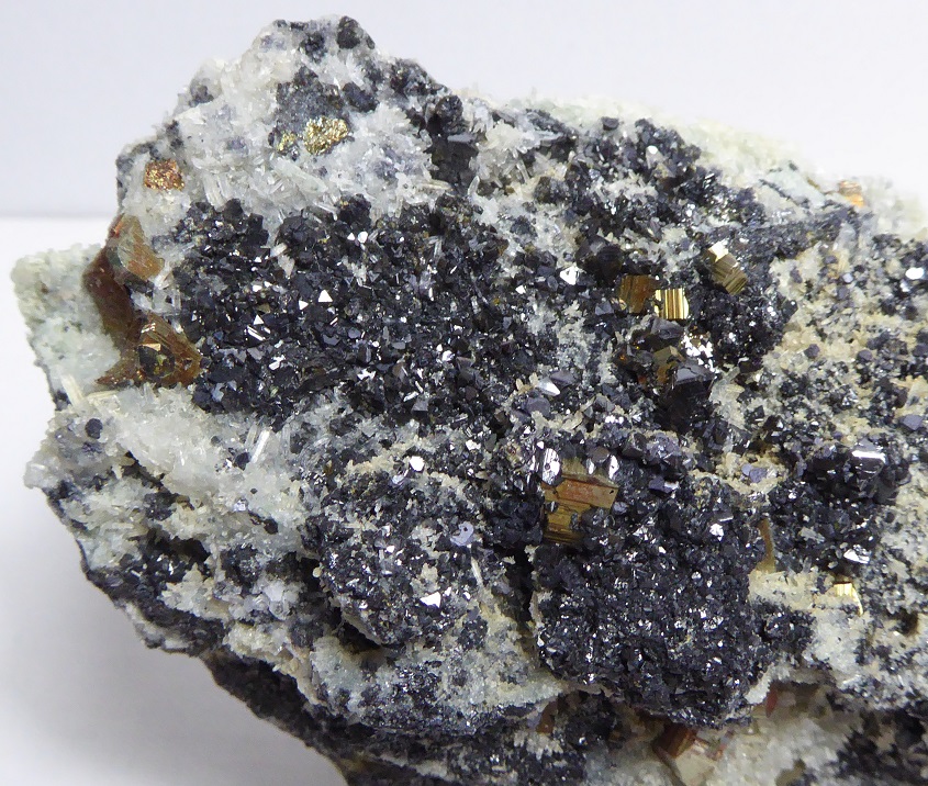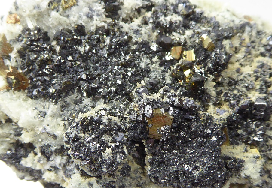 | SPHALERITE, PYRITE, QUARTZ / Secteur minier de Madan, province de Smolyan, Bulgarie / Belle pièce composée de pyrite jaune métallique de 1,2 cm pour les plus grandes, de sphalérite noire de 0,5 cm à éclat métallique et de petits quartz. | Disponible |