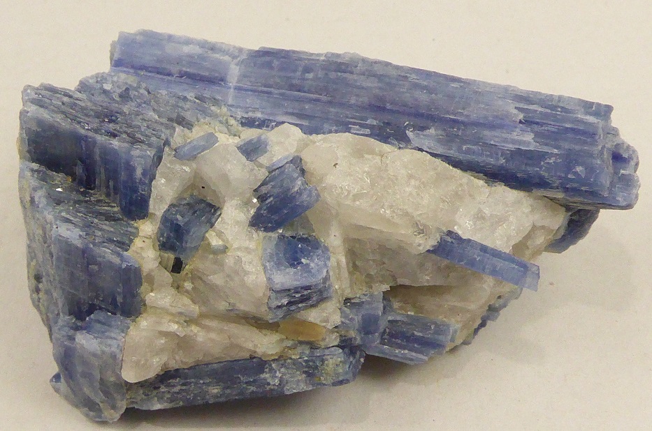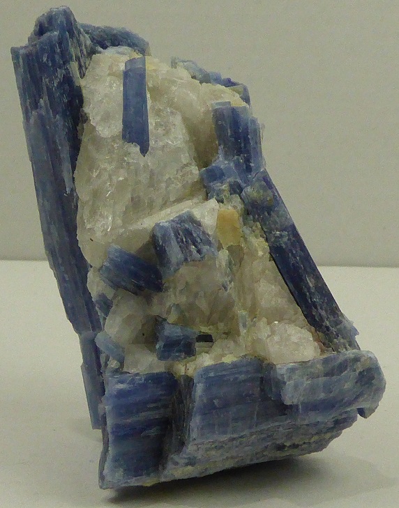 | Description : | Belle pièce composée de cristaux lamellaires de kyanite de couleur bleutée incluse dans du quartz massif transparent. |