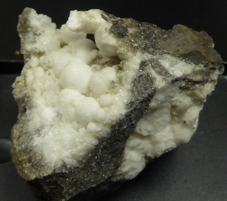 | STRONTIANITE / Laragne-Montéglin, Hautes-Alpes, France / Très belles pièce de ce rare minéral. La pièce montre plusieurs sphérolites blanches dont la plus grande mesure 0,5 cm. De la célestite blanche en forme de ponite se trouve sur la pièce. Ehantillon peu fréquent. Livrée dans sa boite plexi. | Disponible |