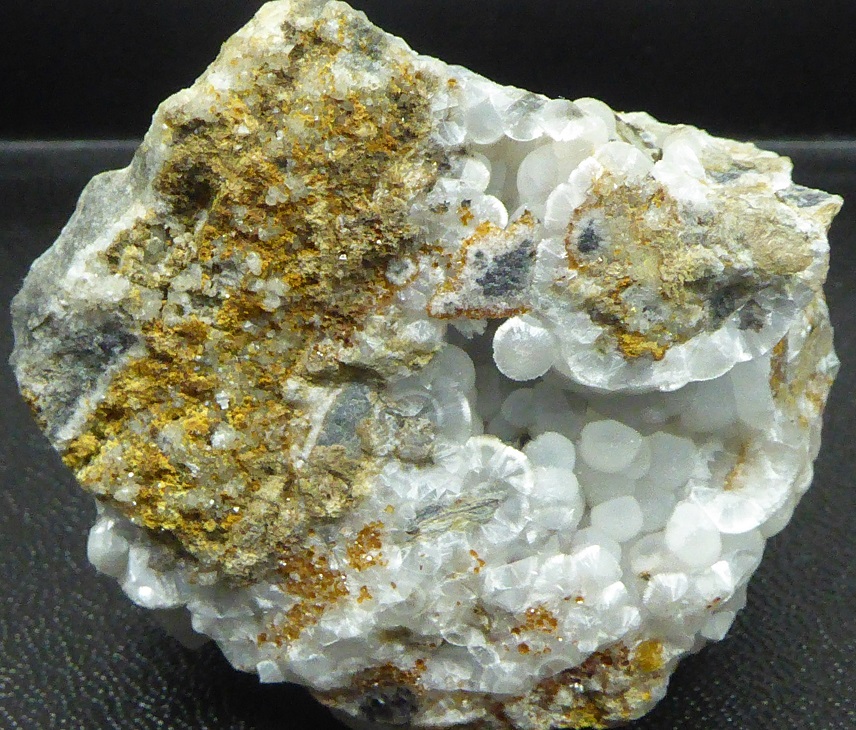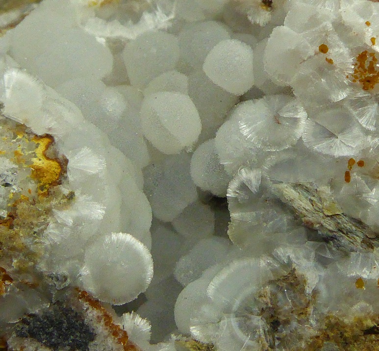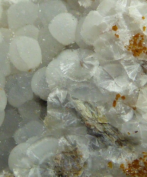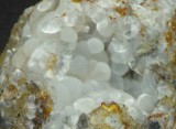 | Description : | Pièce assez rare (pour le gisement) de wavellite en boules blanches fibroradiées mesurant 0,3 cm pour les plus grandes. |