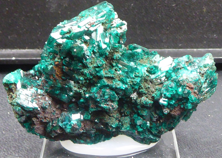 | DIOPTASE / Mine Renéville, District de Kindanba, Département de Pool, république du Congo (Brazaville) / Magnifique pièce de dioptase vertes brillantes. Les plus grands cristaux mesurent 2 cm. Livrée sur un socle plexi. Les photos de dioptase sont difficiles à réaliser, et donc le rendu n'est pas à la hauteur de la réel beauté de la pièce. | Disponible |
