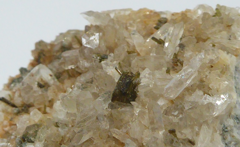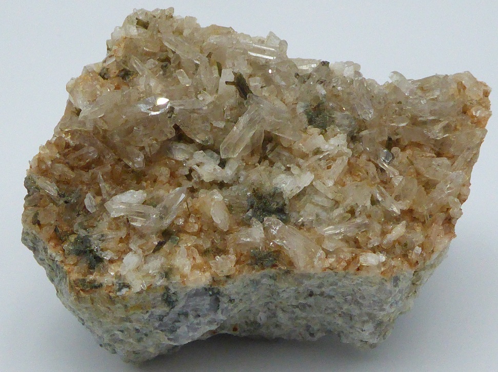 | QUARTZ, épidote / Suisse Très belle pièce de quartz hyalin très finr mesurant jusqu'à 1 cm. Certains sont biterminés. Quelques aiguilles vertes et brillantes d'épidote se trouvent entremélées dans le quartz. | Disponible |