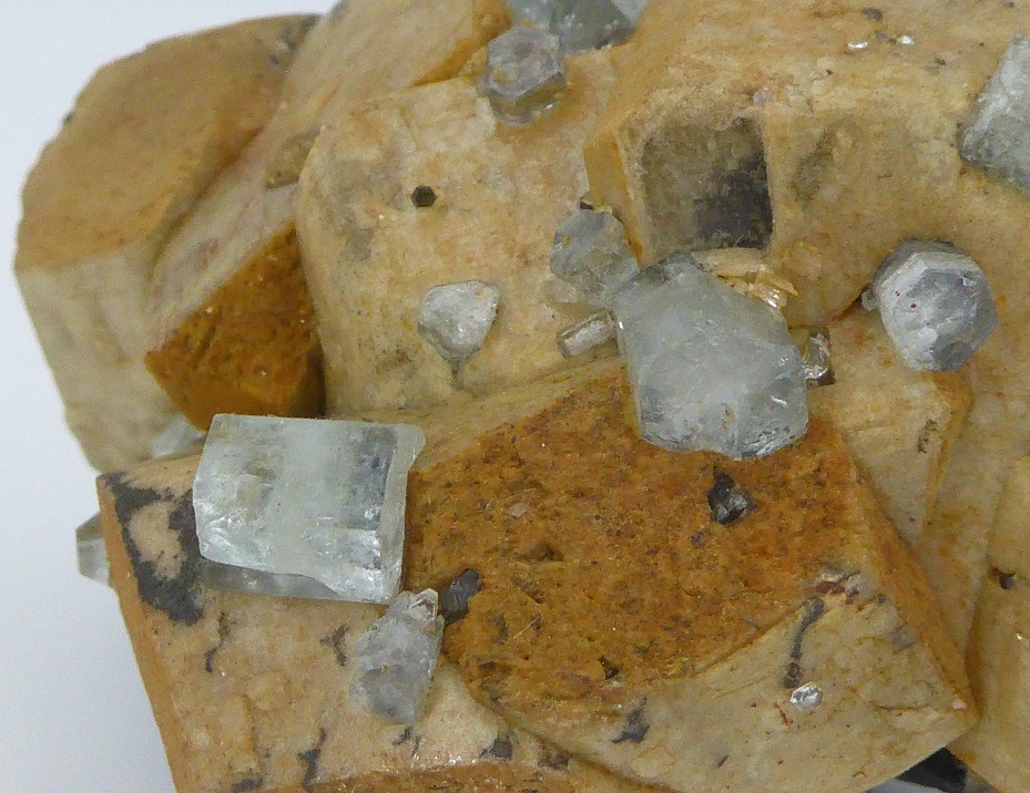 | FLUORAPATITE, sidérite, ferbérite / Panasqueira, district de Castelo Branco, Portugal / Magnifique pièce composée d'une base de ferbérite noire cristallisée, de sidérite jaune crème de 2,5 cm et parsemée de cristaux biterminés de fluoapatite transparents à translucides bleutées mesurant jusqu'à 1 cm. | Disponible |