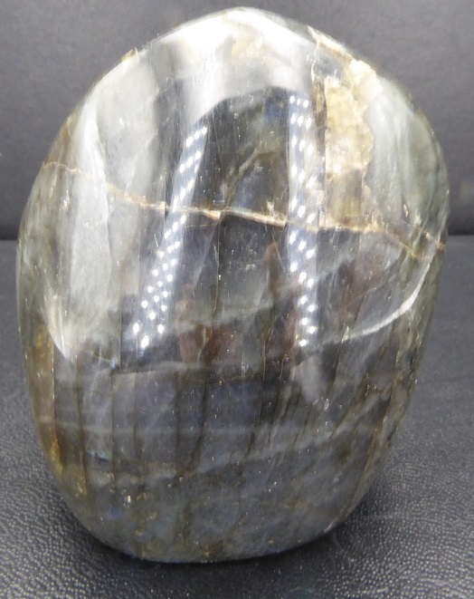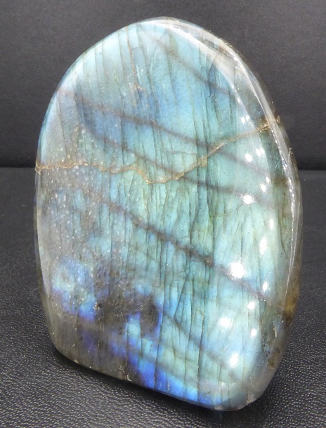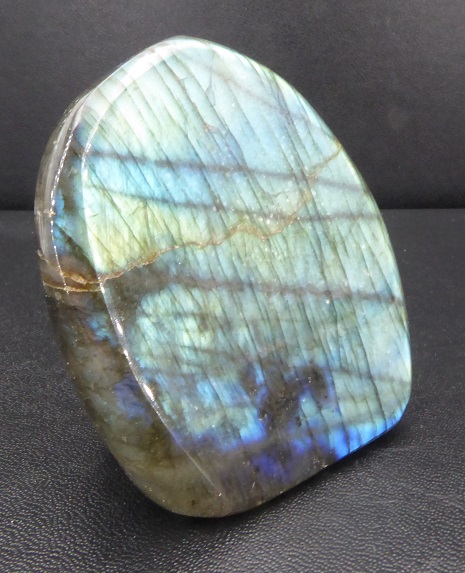 | LABRADORITE (variété d’anorthite) / District d’Ampanihy, Province de Tuléar, Madagascar / Superbe labradorite montrant une belle adularescence avec quelques couleurs du spectre dont le vert, le bleu et le jaune. | Disponible |