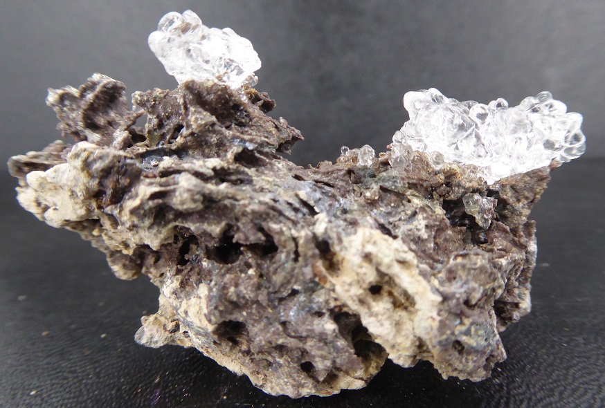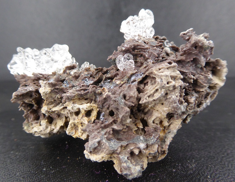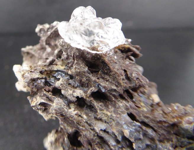| Description : | Curieux échantillon de cette opale de la variété Hyalite posée sur de l'andésite. Elle montre une belle fluorescence verte sous les U. V. courts. |