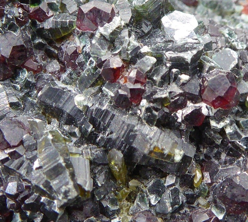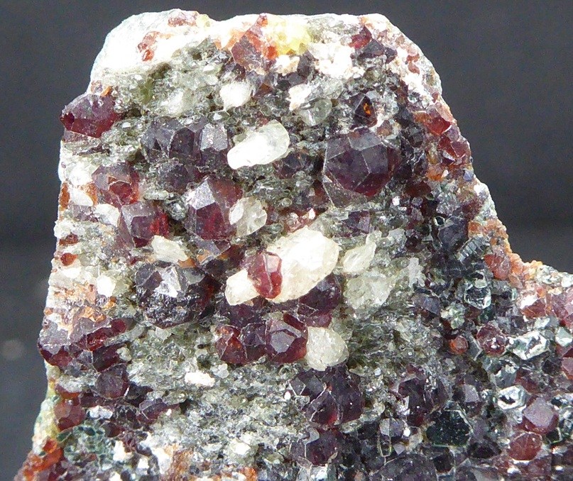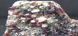 | GROSSULAIRE, CLINOCHLORE / Alchuri, Shigar, Pakistan / Belle pièce composée d'une multitude de grenat de la variété grossulaire rougeâtre posée sur de beaux cristaux de clinochlore mesurant jusqu'à 0,6 cm. Un peu de quartz se trouve sur la pièce. | Disponible |