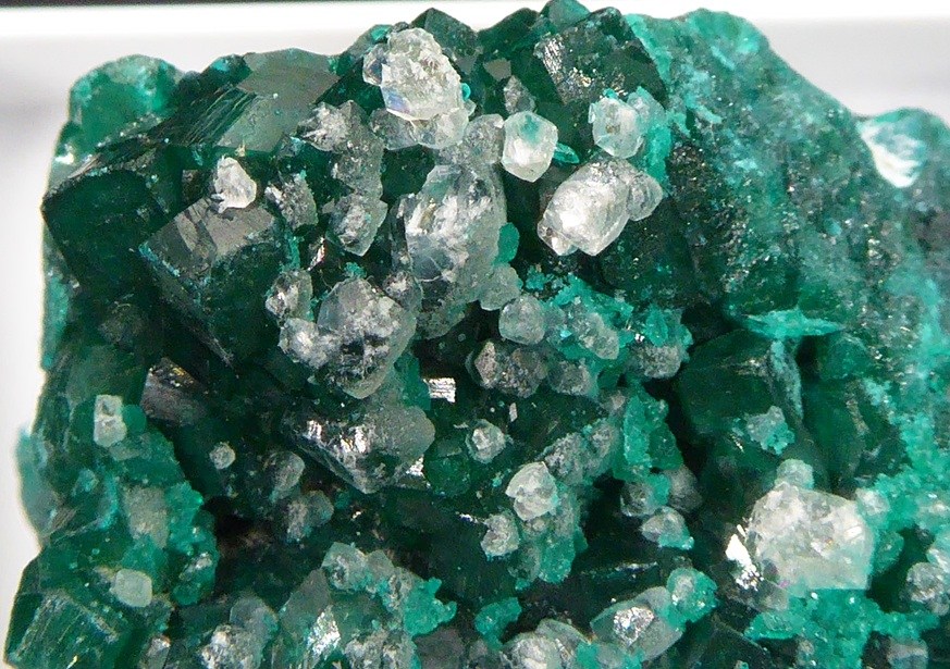 | Rajout Décembre 2025 / DIOPTASE / Mine Tantara, Shinkolobwe, Katanga, R. D. du Congo / Bel échantillon de dioptase d'un beau vert brillant. Les cristaux mesurent 0,3 cm pour les plus grands. Des cristaux blancs de calcite se trouvent sur la dioptase. Livrée dans une boite plexi. | Disponible |