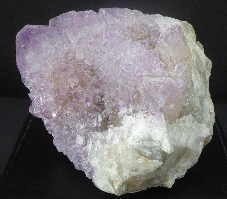 | Description : | Belle pièce de quartz légèrement améthyste avec 2 générations de cristaux. La première est représentée par un quartz gris complétement recouvert par une deuxième génération d'une multitude de petits cristaux pointus avec pour terminaison un cristal plus développé. |