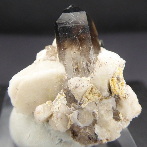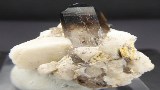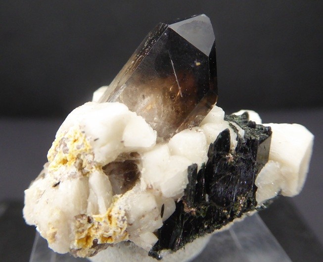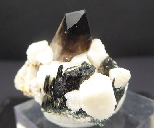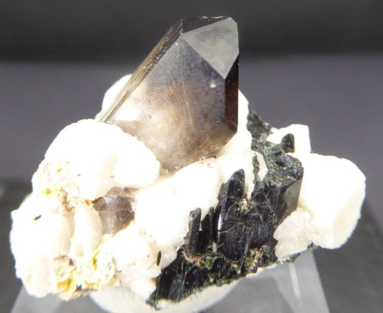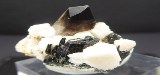 | Rajout Mars 2026 / QUARTZ,AEGIRINE, ALBITE / Mont Malosa, Zomba, Malawi / Superbe pièce composée d'un quartz enfumé de 1,6 cm posé sur de l'albite cristallisée et d'aegirine noire. Une petit baguette d'un minéral non déterminé se trouve dans le quartz | Disponible |