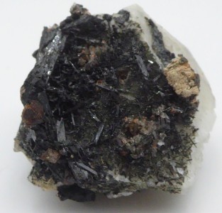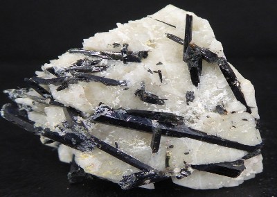 AEGIRINE, microcline / Monts Malosa, District de Zomba, Province de Chilwa, Malawi Bonne pièce d'aegirine noire en baguettes brillantes. La plus grande mesure 2,5 cm. Elles sont posées sue de la microcline blanche. Un petit cristal de zircon et un minéral blanc crème non déterminé se trouvent sur la pièce.