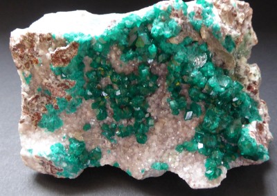 DIOPTASE, dolomie / Tsumeb, région d'Oshikoto, Namibie / Très belle pièce de dioptase verte brillante posée sur de la dolomie blanche. Les cristaux sont bien formés. Quelques-uns sont érodés sur le coté.