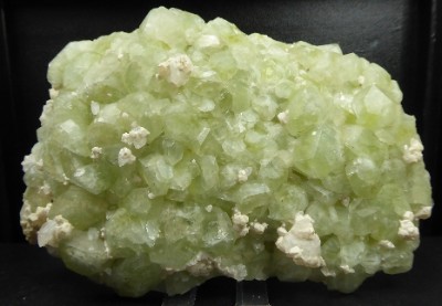 DATOLITE, calcite, apophyllite / Carrière Bor, secteur minier de Dalnegorsk, Massif de Kavalerovo, Russie /Superbe pièce de datolite verte en beaux cristaux brillants et bien formés, quelques cristaux de calcite translucide blanc de 1 cm se trouvent sur la datolite. Ils sont parsemés d'apophyllite opaque blanche. Le dos de la pièce en est recouvert. Livrée dans sa boite.