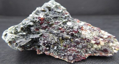 GROSSULAIRE, HEDENBERGITE / Fiumedinisi, Messine, Sicile, Italie / Echantillon peu fréquent d'hédenbergite verte associée à des grenats rougeâtre de la variété grossulaire. Les plus grands mesurent 0,4 cm.