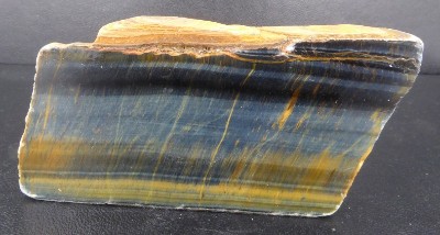 OEIL DE FAUCON / Prieska, Siyathemba, Province du Cap, Afrique du Sud / Belle pièce de quartz avec inclusions de riebéckite fibreuse nommée oeil de faucon. Une face est polie et l'autre brute.