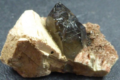 QUARTZ, ORTHOSE, ALBITE / Montalegre, Vila Real, Portugal / Jolie pièce composée de 2 cristaux de quartz enfumé de 1 cm. Ils sont accolés et enchassés sur un cristal d'orthose de 1,7 cm et dans de l'albite.