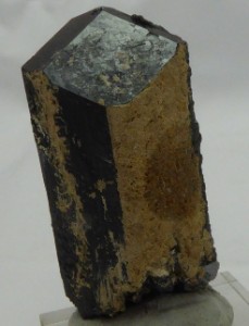SCHORLITE / Usakos, district de Karibib, Région des monts Erongo, Namibie / Beau monocristal de schorlite biterminéemontrant des faces brillantes. Plusieurs cristaux sont implantés sur le cristal principal. Le plus grand mesure 1,5 cm.