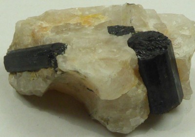 SCHORLITE / Secteur de Saint-Pierre-la-Bourlhonne, Ambert, Puy-de-Dôme, France / Echantillon intéréssant de tourmaline noite incluse dans du quartz massif. Les cristaux montrent de belles faces brillantes mais ne sont pas terminés. Le plus grand mesure 4,5 cm.