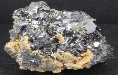 SPHALERITE, DOLOMIE / Cavnic, comté de Maramures, Roumanie / Bel agrégat de cristaux noirs de sphalérite. Le cristaux les plus grands mesurent 0,8 cm. Ils sont parfaits et brillants. Un peu de dolomie de couleur brune se trouve sur la sphalérite.