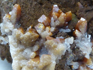 WULFENITE, calcite / mine Staro Igrcevo, Mezica, Slovénie / Très belle pièce de wulfénite provenant de Mezica. Les cristaux sont en forme de pyramide et ont une belle couleur caramel. Ils sont parfois recouverts par de la calcite blanche. Les plus grands mesurent 0,7 cm. Quelques uns sont clivés. Echantillon peu fréquente sur le marché.