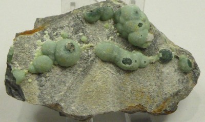 WAVELLITE / Mont Mauldin, Montgomery Co, Arkansas, USA / Magnifique échantillon de wavellite verte montrant des sphérules de 0,8 cm. Pièce très esthétique. Livrée dans une boite plexi.